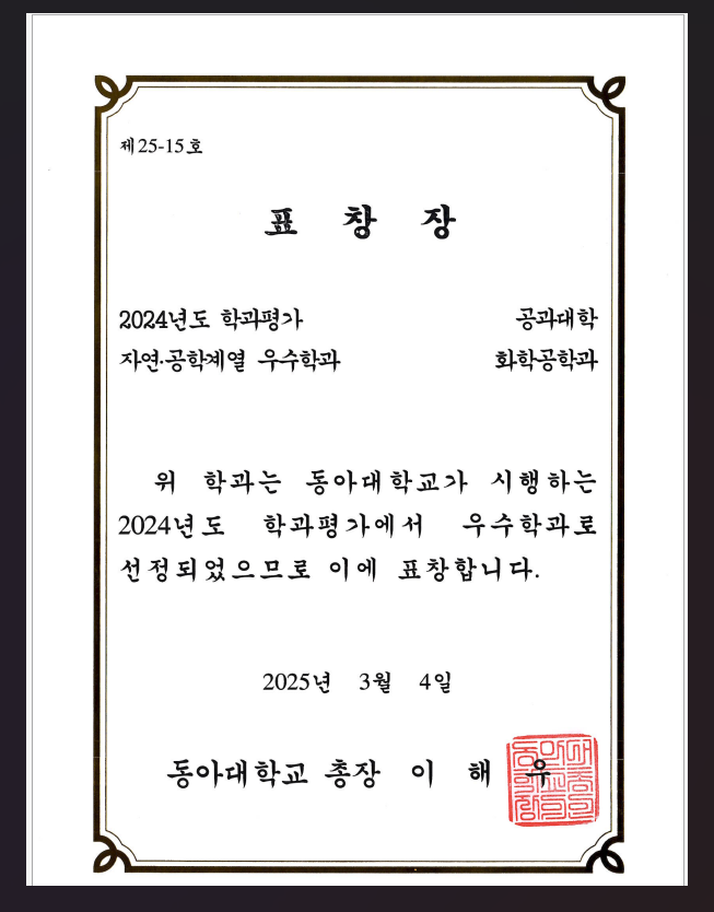 커뮤니티 열린 미래 꿈이있는 대학, 동아대학교 메인으로 이동 커뮤니티 학과안내 교수소개 공학인증 대학원 커뮤니티 (재)우천장학회 동문회 기타 닫기 포토갤러리 진로 로드맵 학사공지 취업게시판 학사일정 학과행사 수업자료실 화학공학과 뉴스 닫기 커뮤니티 커뮤니티 진로 로드맵 학사공지 취업게시판 학사일정 학과행사 수업자료실 화학공학과 뉴스 포토갤러리 SNS 목록열기 FACEBOOK 공유하기 TWITTER 공유하기 BLOG 공유하기 SNS 목록닫기 인쇄 url 복사 2024년도 학과평가 우수학과 선정 화학공학과 2025.05.12 조회수 184 저작권 등 다른 사람의 권리를 침해하거나 명예를 훼손하는 게시글은 이용약관 및 관련법률에 의해 제재를 받으실 수 있습니다. 첨부파일 학과평가 우수.png (211KB) 이전글 2025 화학공학과 체육대회 2025-05-12 다음글 2025 한국기초과학연구원 현장견학 2025-05-12 목록