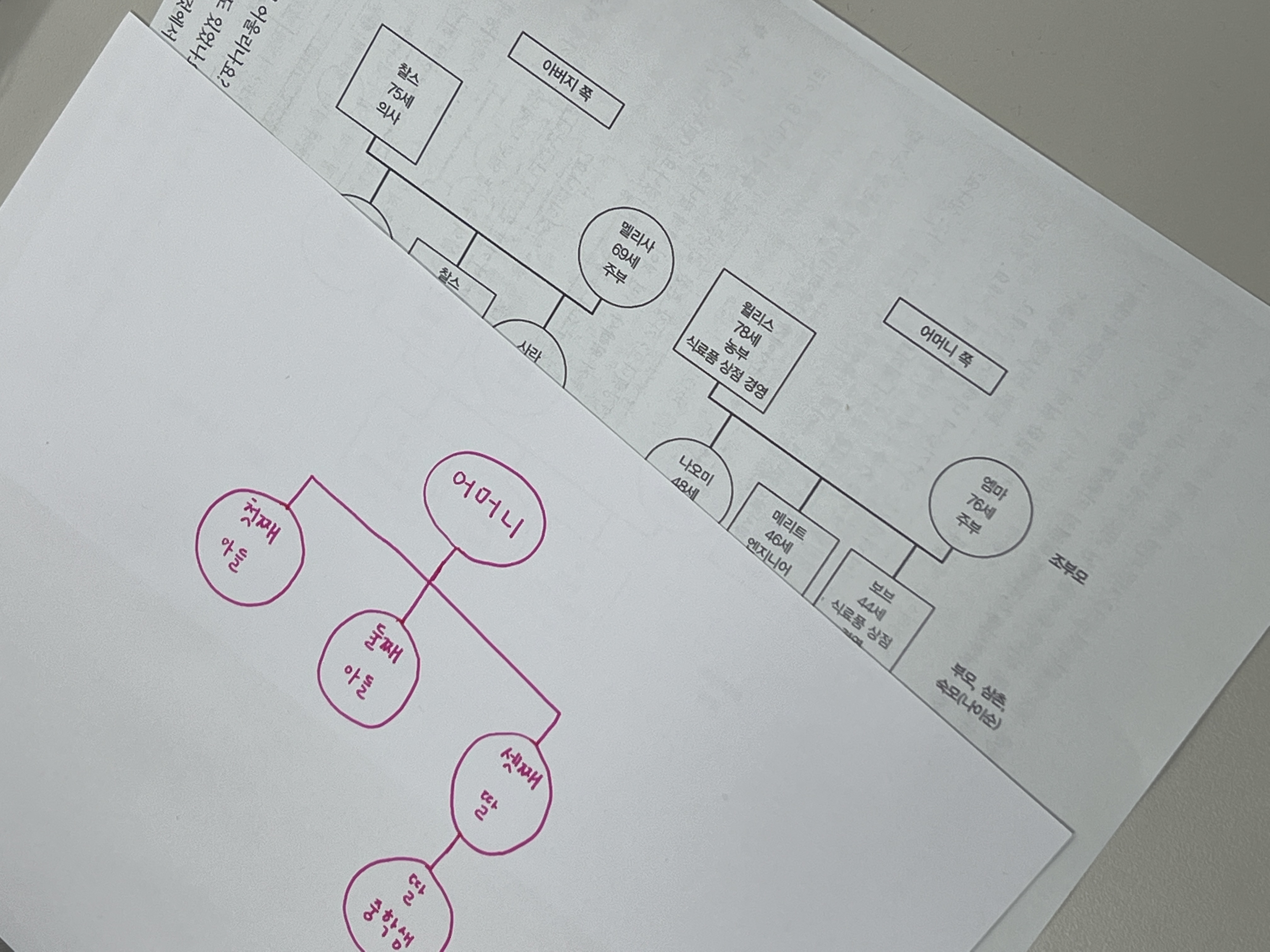 발자국 회원들 모두 가계도 작성법을 익히고 영화 속 가족의 가계도를 정확하게 작성하였습니다.