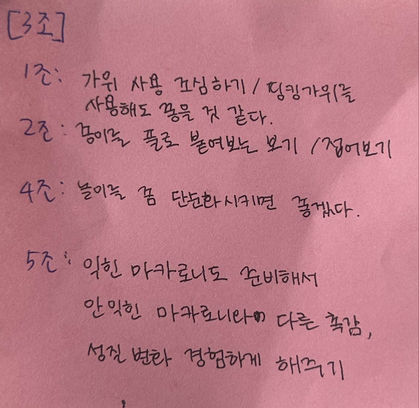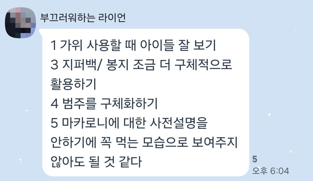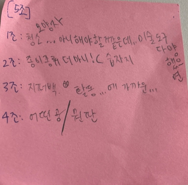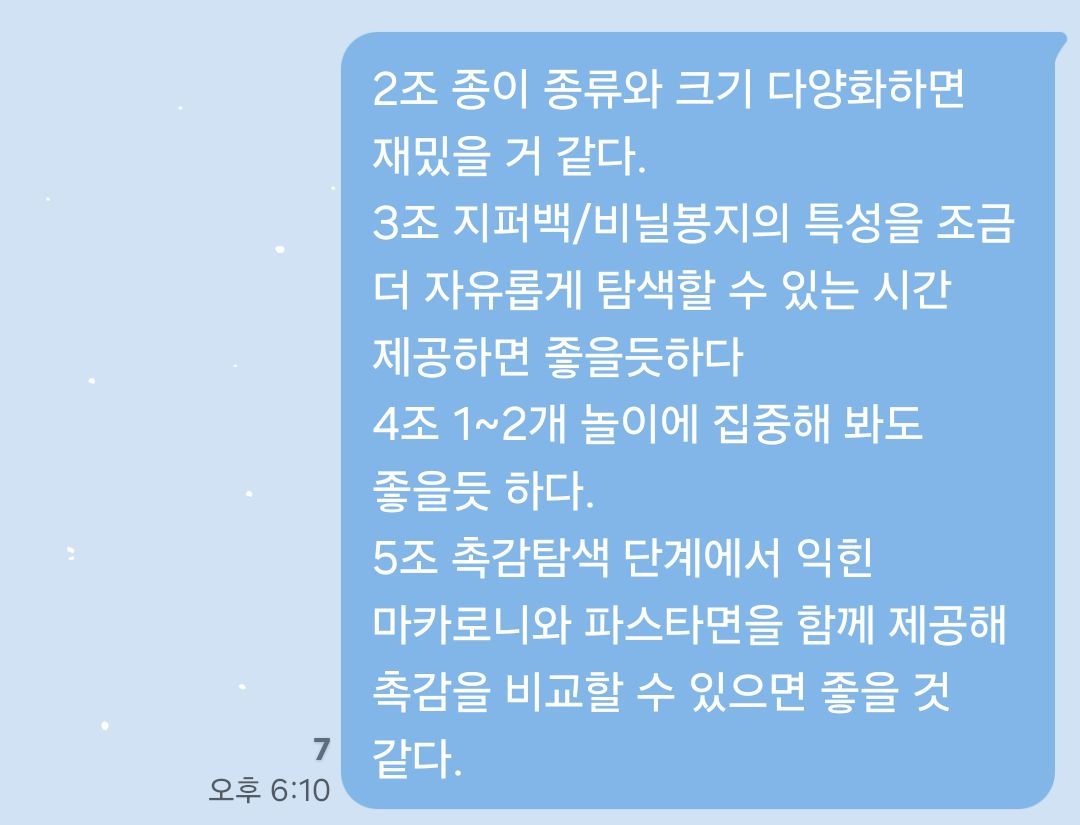 피드백 과정에서 각 모둠은 자신들의 모둠을 제외한 다른 모둠의 활동 계획을 들은 후 떠오르는 피드백 내용을 포스트잇과 메모장에 기록하였고, 이를 단체 대화방에 공유해 각 모둠이 현장 활동 전 준비한 놀이를 보완하는 시간을 가질 수 있도록 안내하며 활동을 마무리하였습니다.