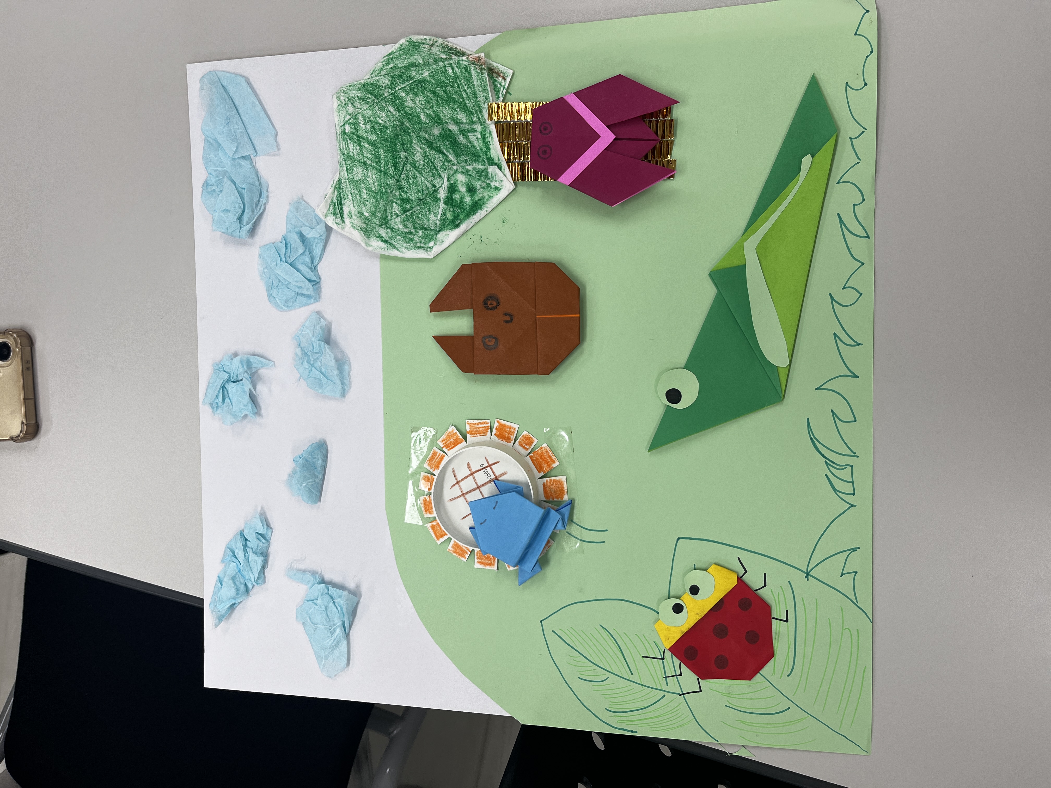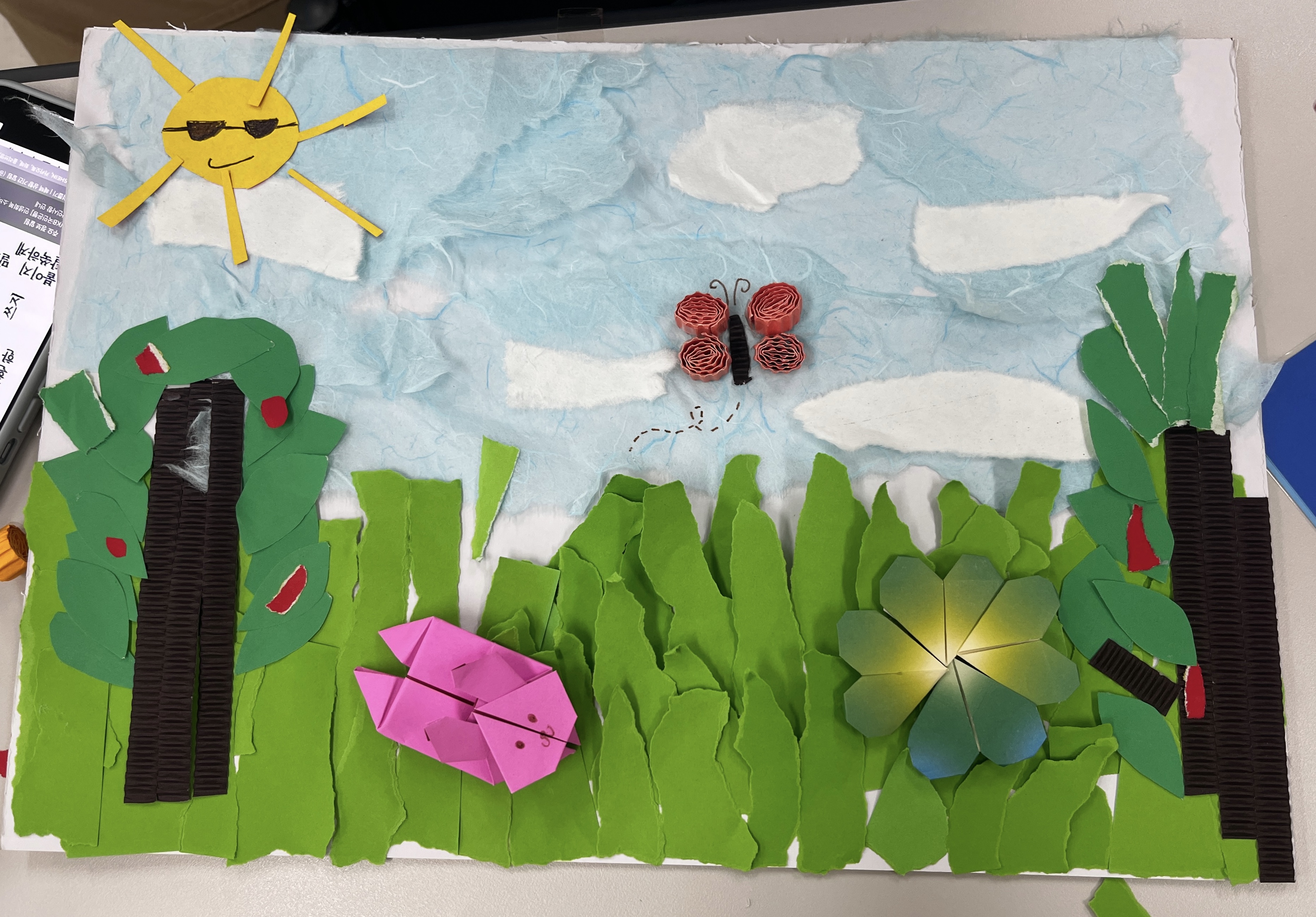 색종이를 활용해 종이 접기를 하거나 한지를 찢어 붙이고, 신문지를 구겨 입체감을 표현해보기도 하며 아이들에게 어떤 도움이 되는지 생각해보았습니다. 이후에는 모둠의 작품을 돌아가며 발표하였습니다.