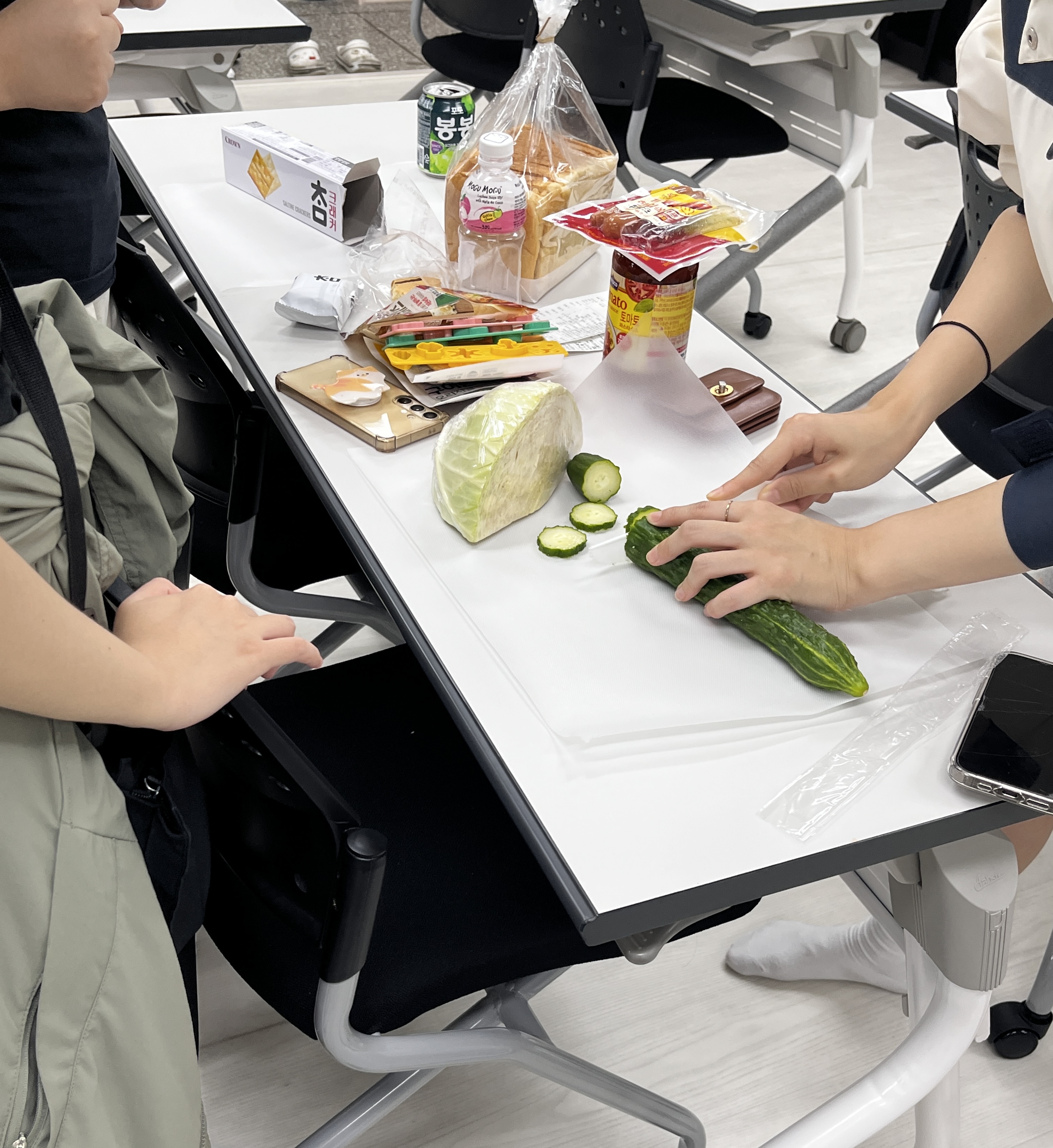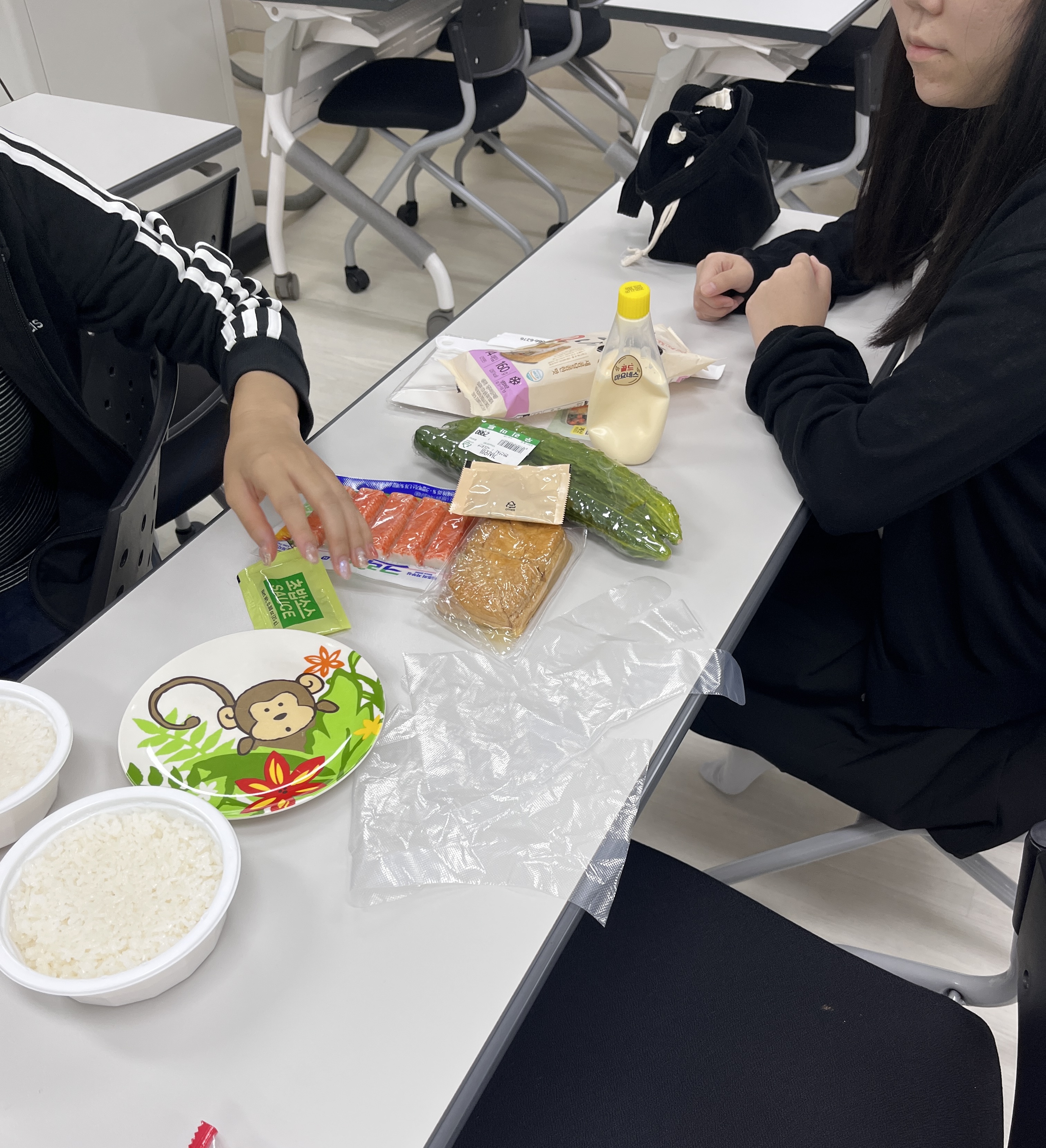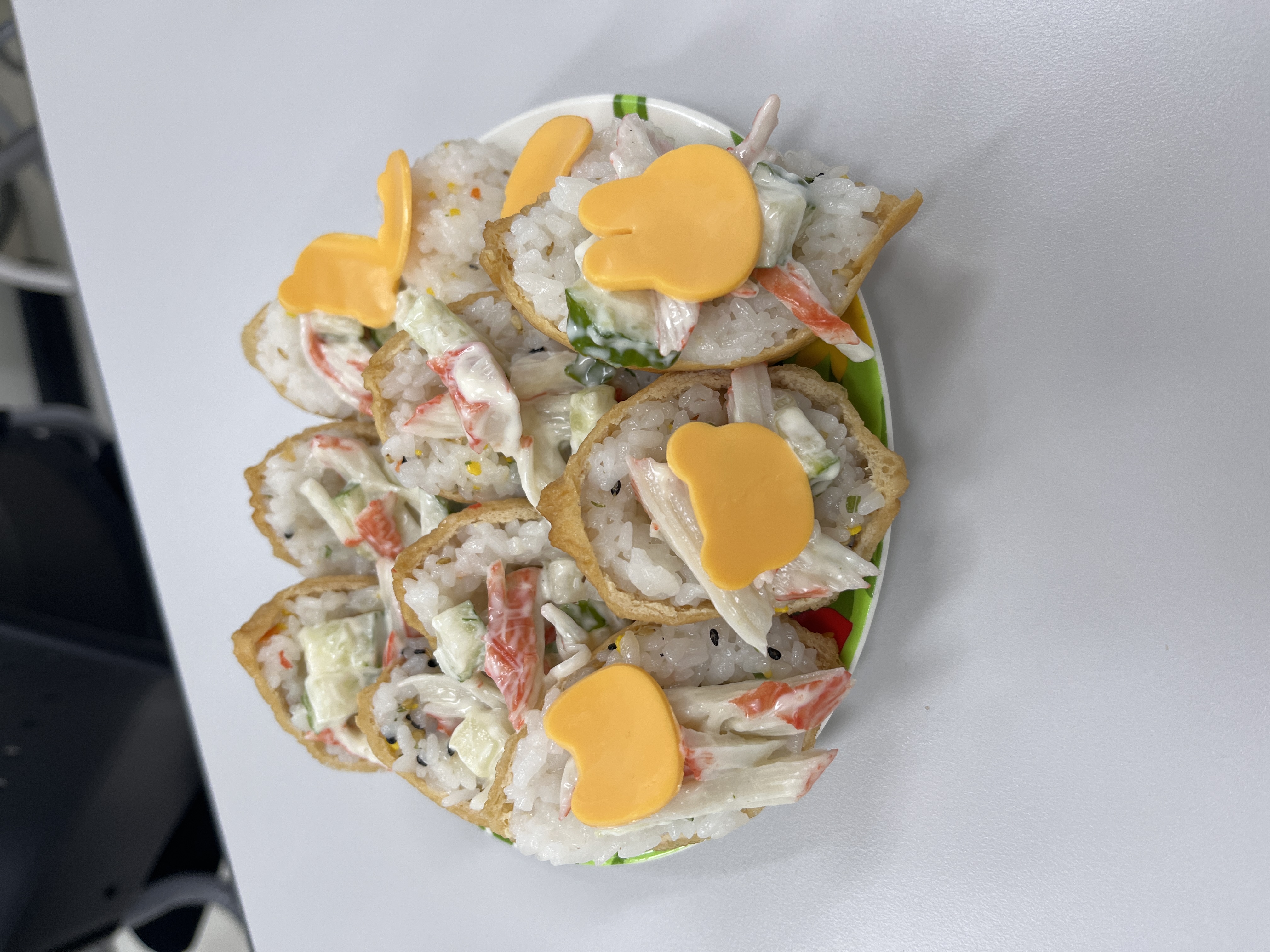 오이를 잘게 다져서 아이들이 좋아하는 맛살과 마요네즈와 함께 버무려서 샐러드를 만든 후 유부초밥 속에 넣어 아이들이 오이맛을 덜 느끼며 맛있게 먹을 수 있는 음식을 만들어 보았습니다.