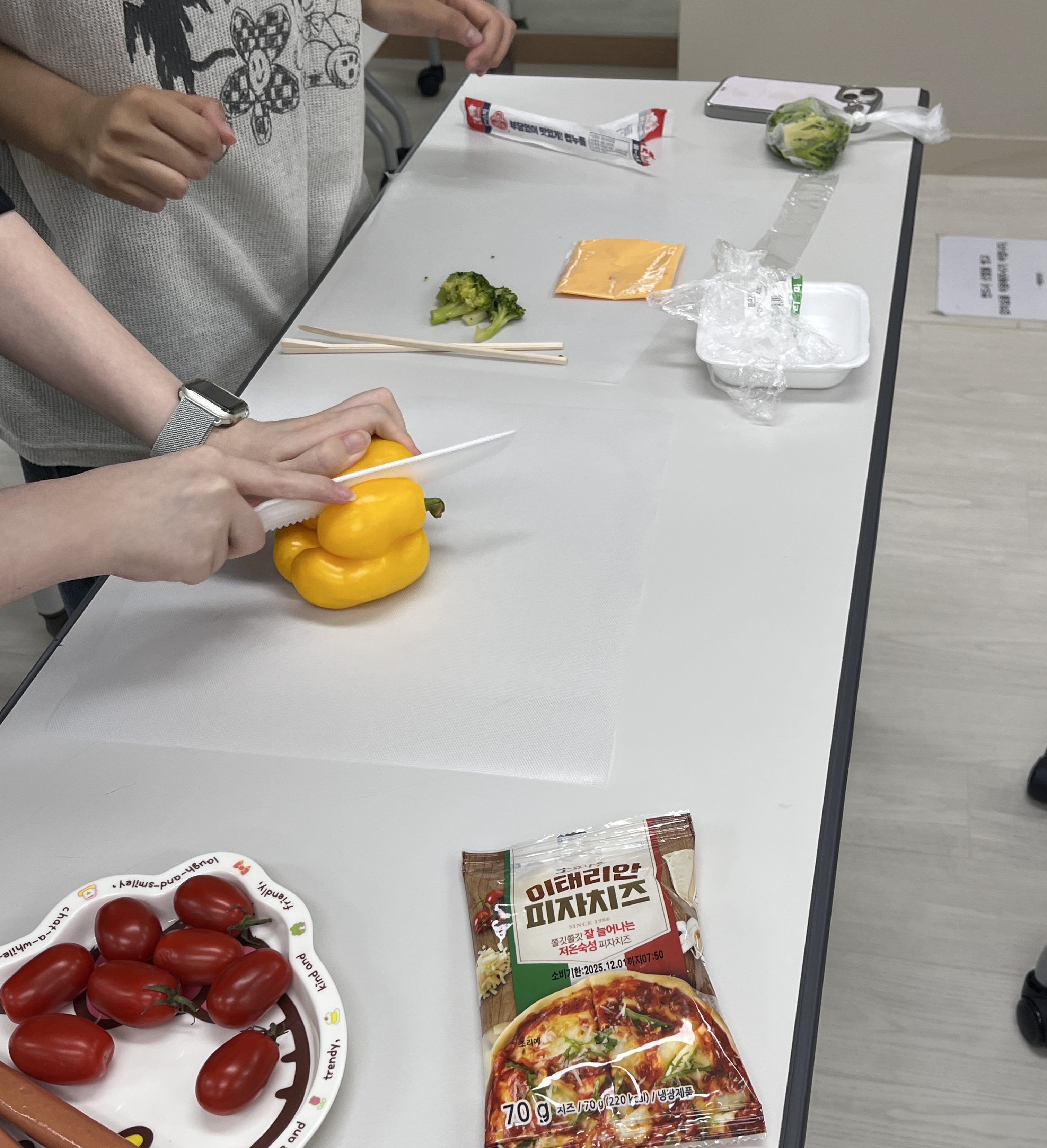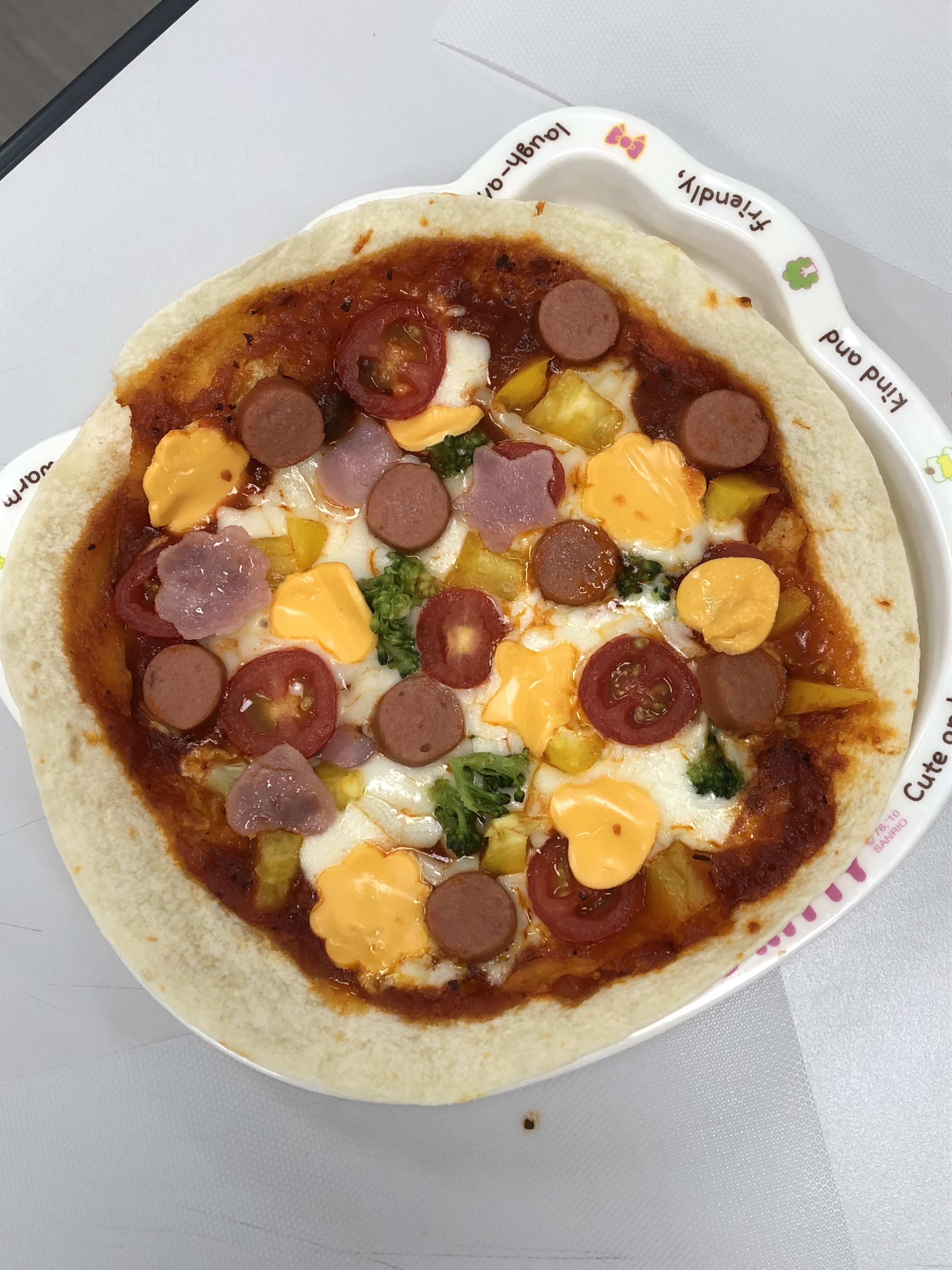 마지막으로 또띠아 위에 토마토 소스, 토마토, 치즈, 소세지를 올리고 파프리카와 브로콜리를 잘게 잘라 토핑으로 올려 피자를 만들고 또띠아에 소스, 소세지, 치즈, 양배추, 파프리카, 브로콜리 등을 넣고 아이들이 채소를 볼 수 없게 말아서 브리또도 요리해 보았습니다.