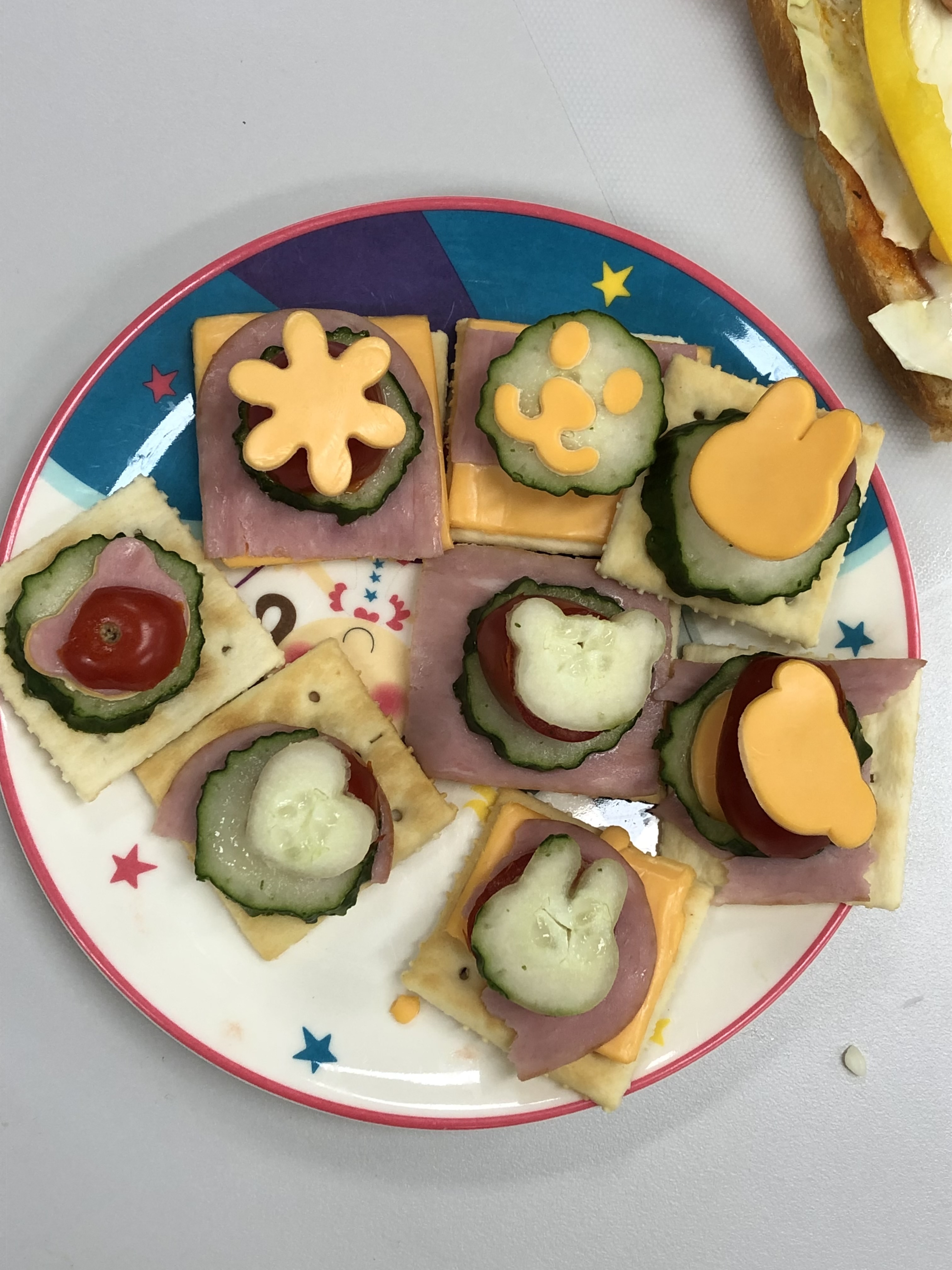 맛있는 식빵 위에 토마토 소스를 바르고 치즈 밑에 아이들이 볼 수 없게끔 숨기고 치즈 위에 소세지와 함께 노란색 파프리카를 길쭉하게 잘라 꾸며 피자를 요리해 보았습니다. 그리고 크래커 위에 토마토, 햄, 오이를 잘라 올리고 위에 동물, 꽃, 표정 등 다양하고 귀여운 모양으로 자른 체다치즈로 장식을 해서 채소를 싫어 하는 아이들도 재밌고 즐겁게 먹을 수 있는 까나페를 만들었습니다.