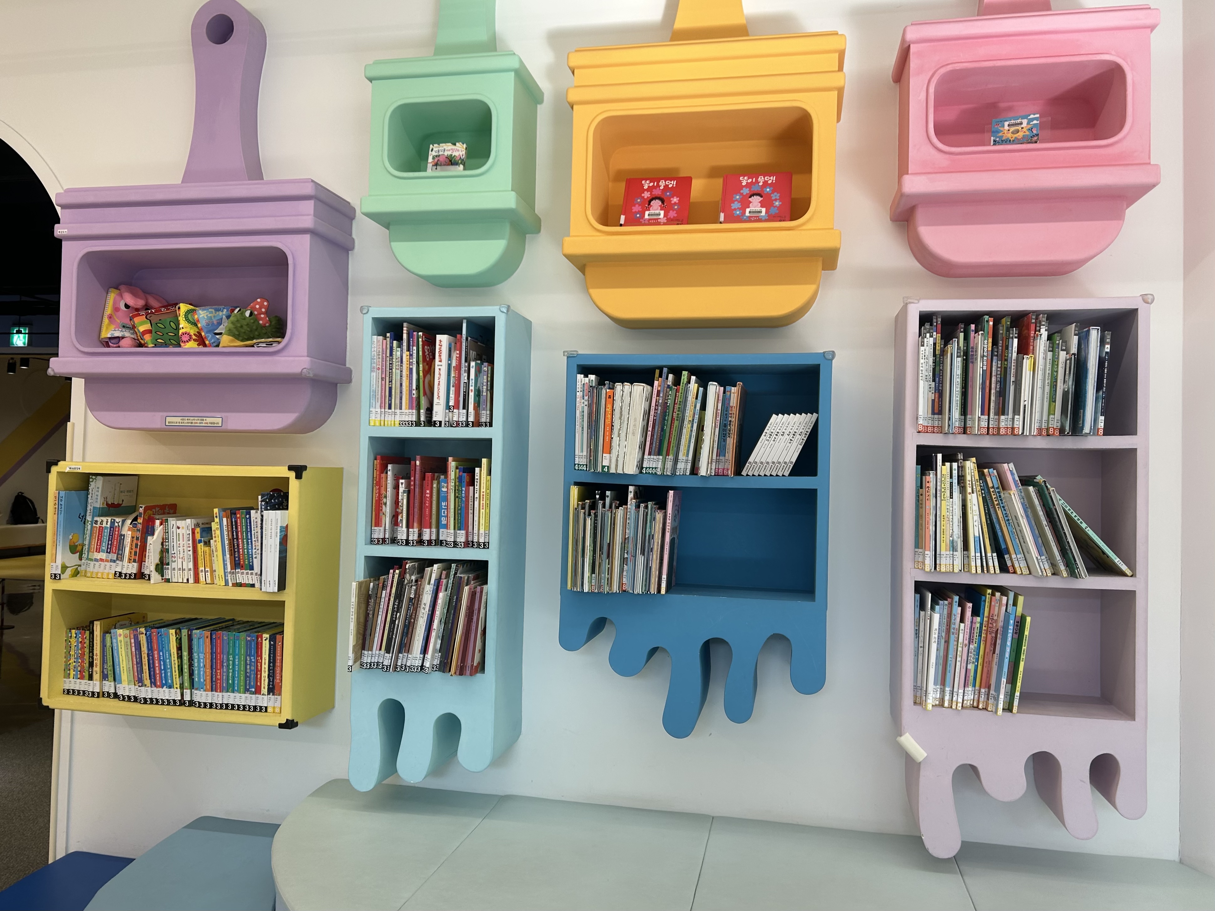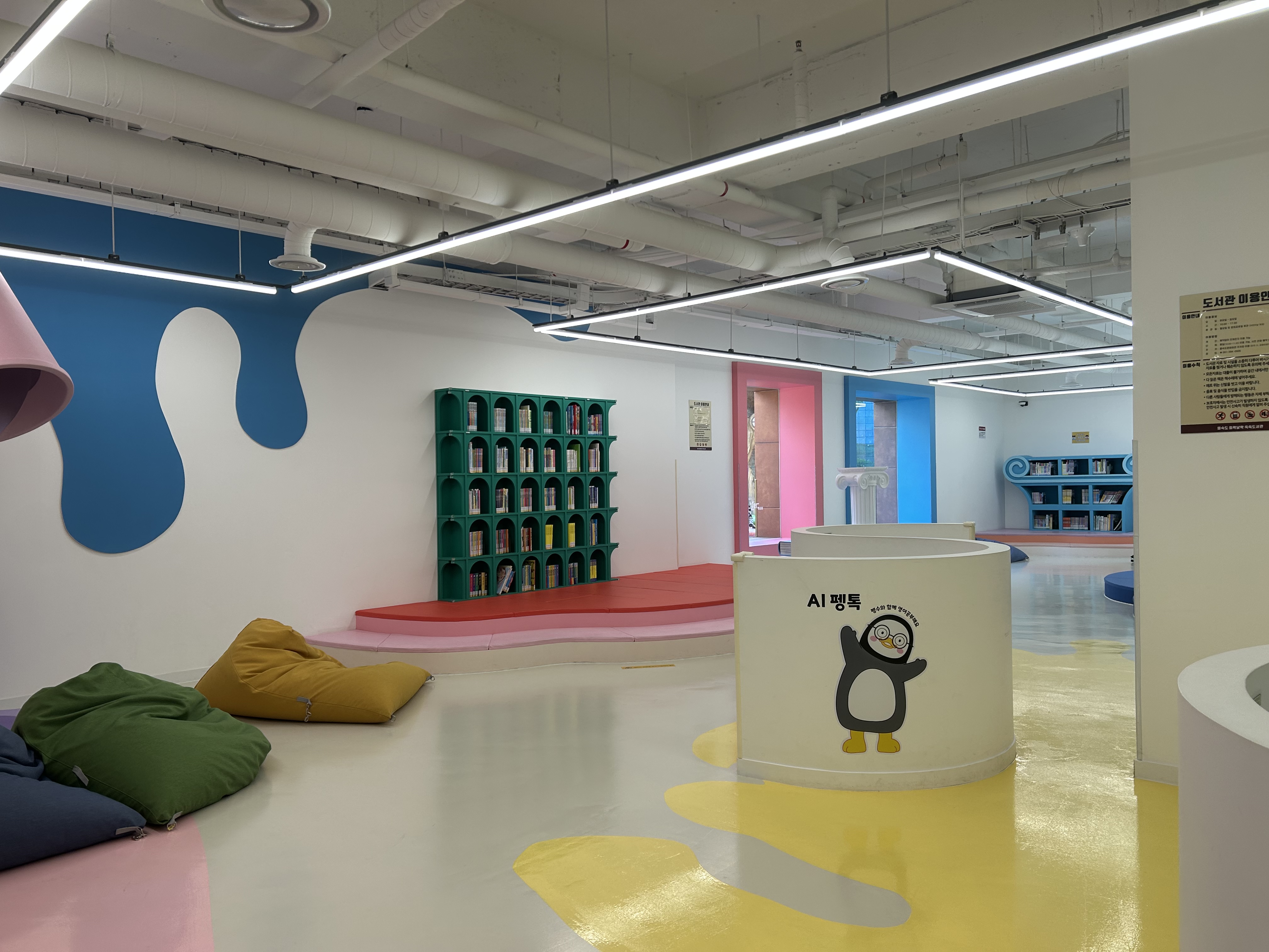 한편에는 연령대별로 나뉘어져있는 다양한 책과 AI학습 체험을 할 수 있는 도서관 및 야외공간이 있었는데, 평소에는 쉽게 접하지 못하는 헝겊책과 그림책 같은 다양한 동화책을 구경해 볼 수 있었습니다.