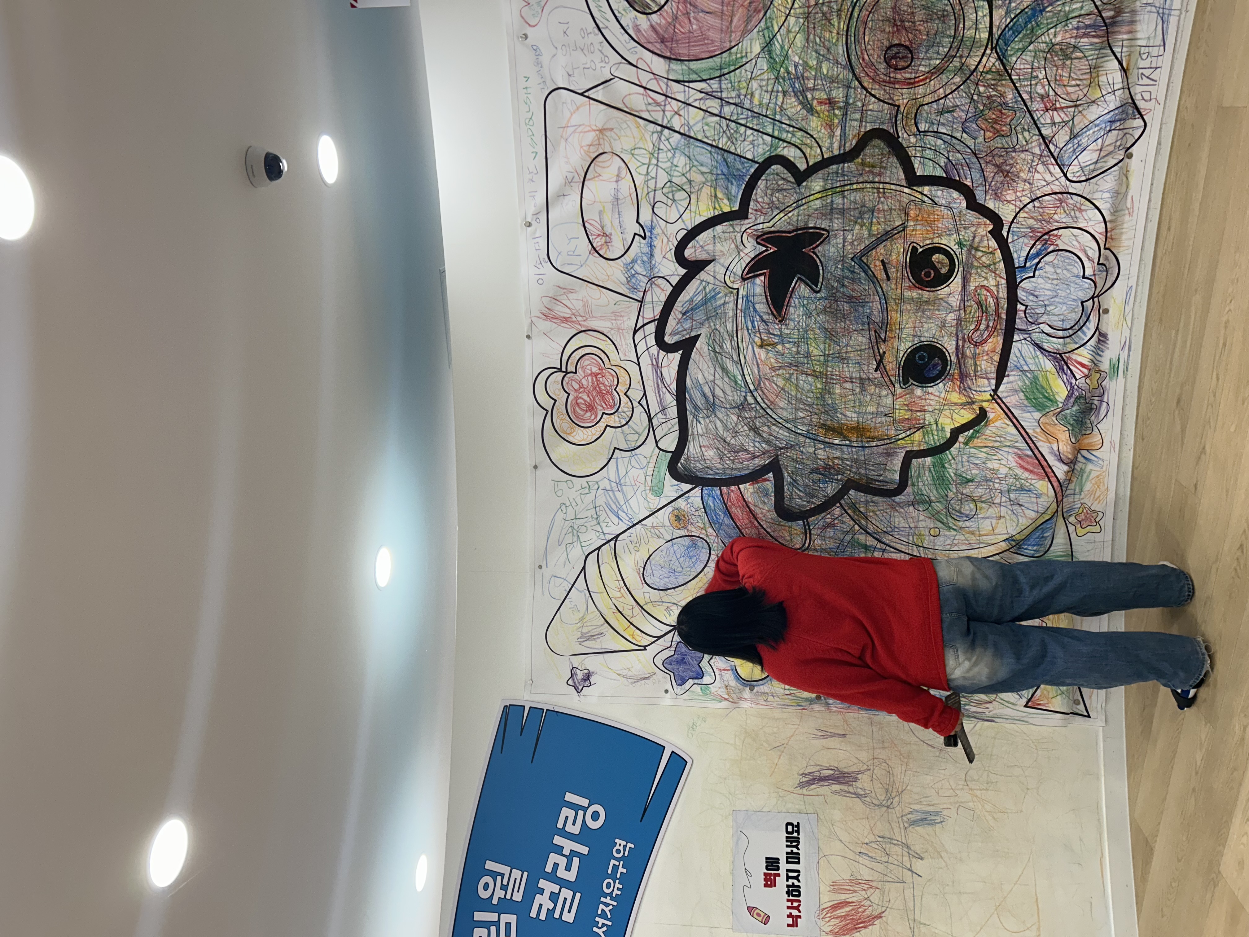 다른 층에는 넓은 벽에 아이들이 다양한 도구와 재료들을 활용해 그림을 그려볼 수 있는 공간이 있었습니다.