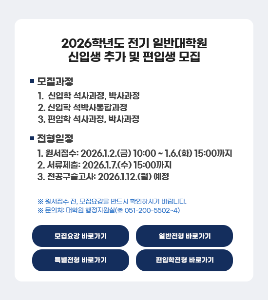세계로 미래로 Pride Dong-A 인류사회의 발전과 정의 실현에 이바지 할 수 있는 지도적 인재를 양성한다 세계로 미래로 Pride Dong-A 인류사회의 발전과 정의 실현에 이바지 할 수 있는 지도적 인재를 양성한다 이전 장면 다음 장면 정지 재생 공지사항 DONG-A University Graduate School 동아대학교 대학원 다양한 소식을 만나세요. 공지사항 더보기 DONG-A Graduate School Admission 2026학년도 입학전형 일반대학원 입학전형 일정 / 신입생 모집요강 다운로드 입학전형 일정 모집요강 다운로드 상담안내 TEL. 051-200-5502~4 FAX. 051-200-5505 평일 오전 9시 ~ 오후 5시 점심시간 : 오후 12시~ 1시 (토, 일, 공휴일 휴무) 장학금 안내 대학원 등록금 안내 학·석사 연계과정 Admission For Foreign Students 전문 & 특수 대학원 이전 장면 다음 장면 국제전문대학원 Graduate School of International Studies 법학전문대학원 Graduate School of Law 교육대학원 Graduate School of Education 사회복지대학원 Graduate School of Social Welfare 법무대학원 Graduate School of Law SMART LINK 입학전형 외국인학생 입학안내 Admission for foreign students 논문표절검사 학사일정 통합정보시스템 수강신청 도서관